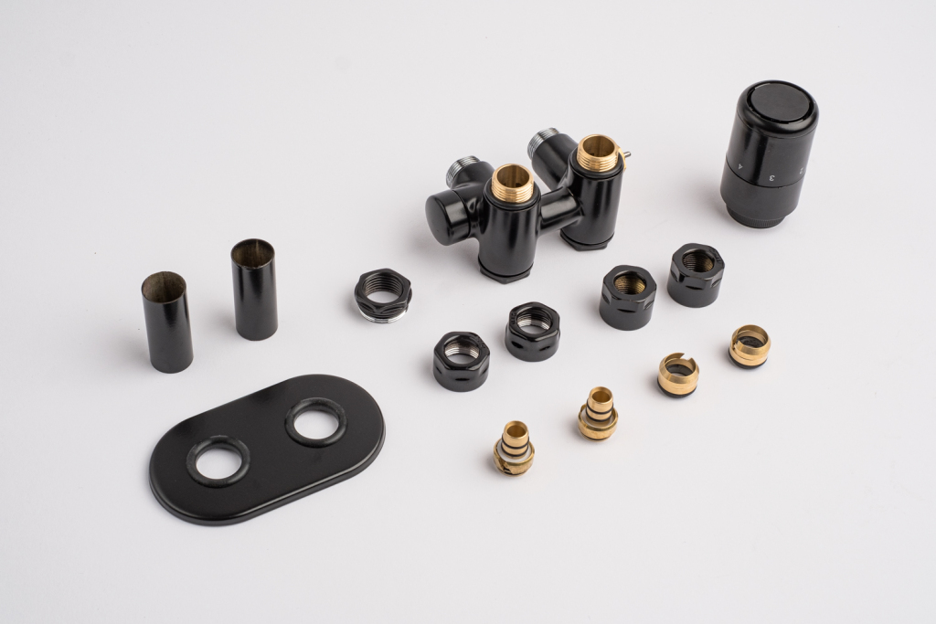 Kompletná sada okrem ventilu obsahuje aj krycie rozety a svorné šróbenie na pripojenie na meď 15 mm a Alupex 16 mm.